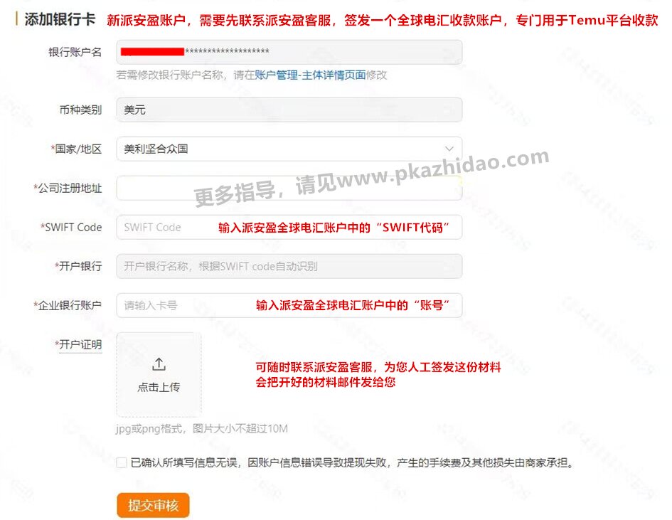 将以上派安盈的美元收款银行信息复制到Temu后台,就可以完成绑定了。